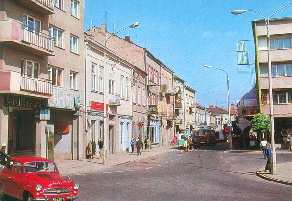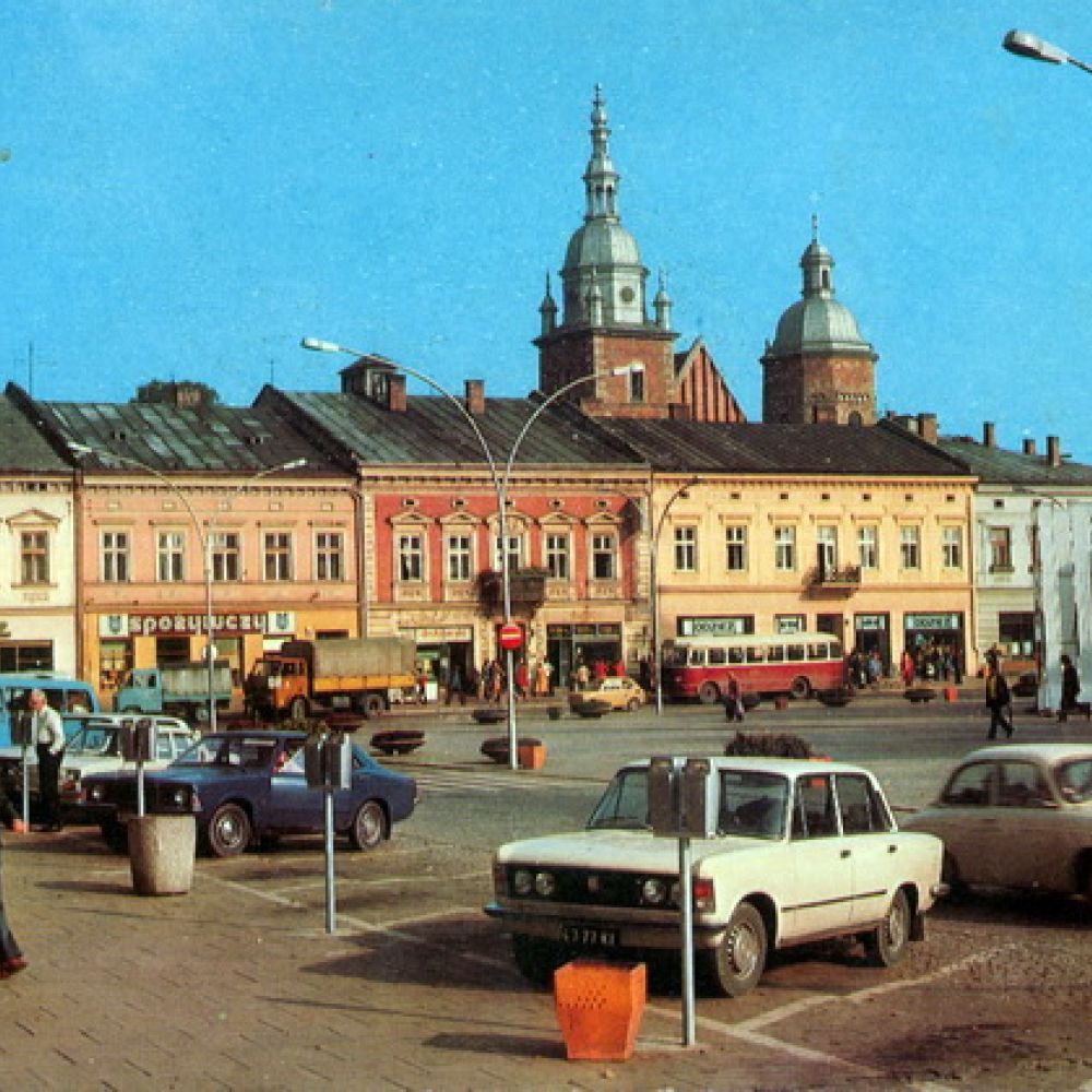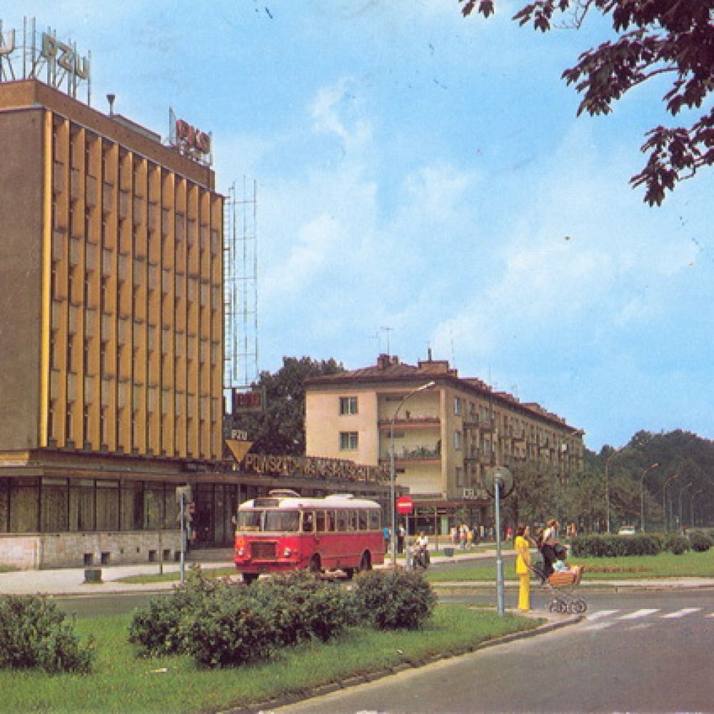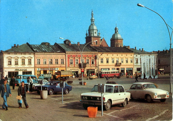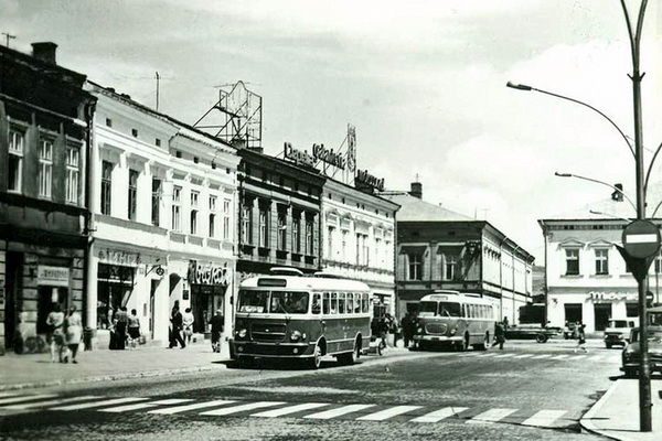 Pocztówka: Biuro Wydawniczo-Propagandowe fot. P.Krassowski Autobusy San H100B w Rynku – w tyle fotografi przed obecnym Empikiem stoi Jelcz 043 (turystyczny ogórek)