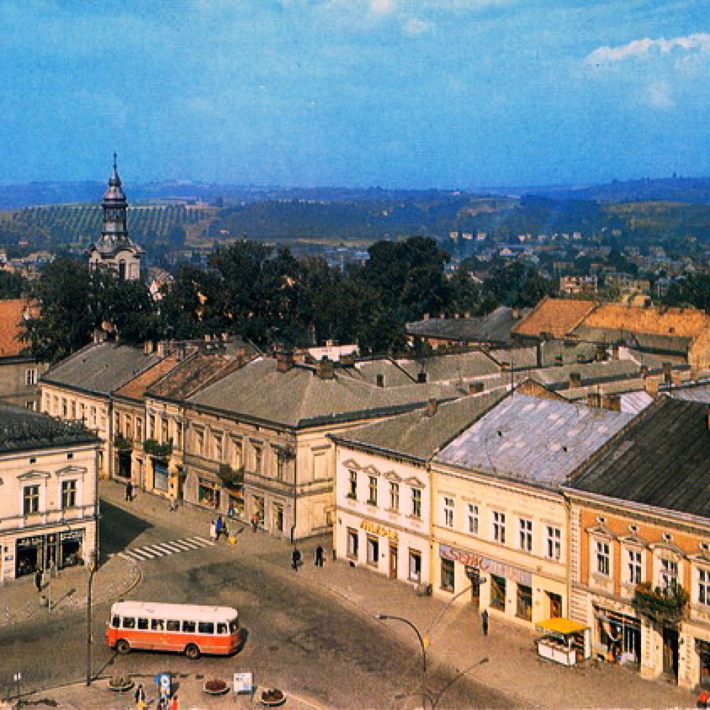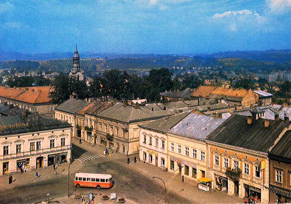 Pocztówka: Wydawnictwo Polskiego Towarzystwa Turystyczno Krajoznawczego fot. T.Hermańczyk Autobus San H100B na wschodniej pierzei Rynku