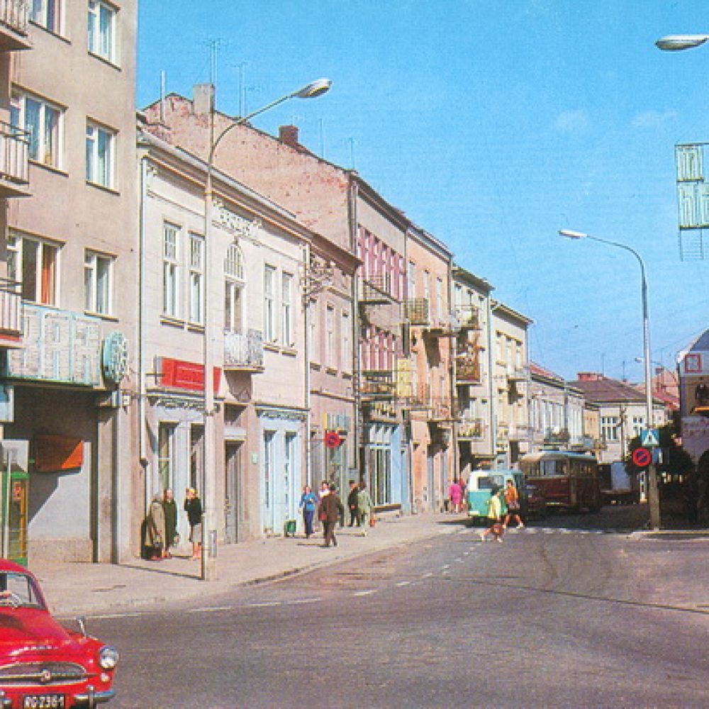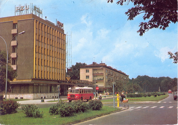Pocztówka: Krajowa Agencja Wydawnicza fot. A.Chmielewski Autobus San H100B #83 zbliża się do przystanku na Alei Wolności – w tle widoczny inny egzemplarz