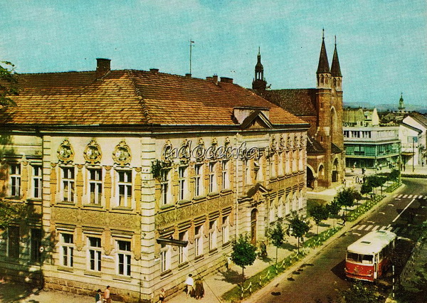 Pocztówka: Krajowa Agencja Wydawnicza fot. J.Rosikoń Autobus San H100B oddziału Gorlickiego wyjeżdża z gorlickiego Rynku ulicą 3go Maja (obecnie deptak)